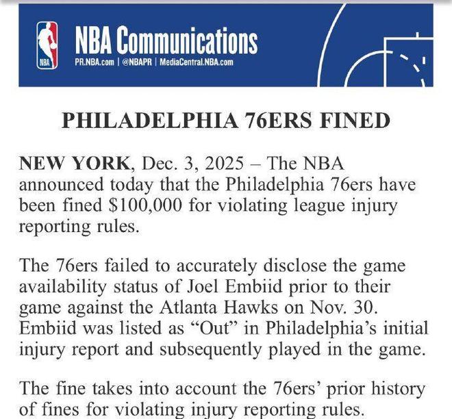 NBA官方公布罚单,对费城76人处以10万美元的罚款,理由是76人在12月1日对阵亚特兰大老鹰的比赛前,将恩比德的状态列为缺席,但恩比德最终登场比赛,违反联盟有关的伤病报告规则。